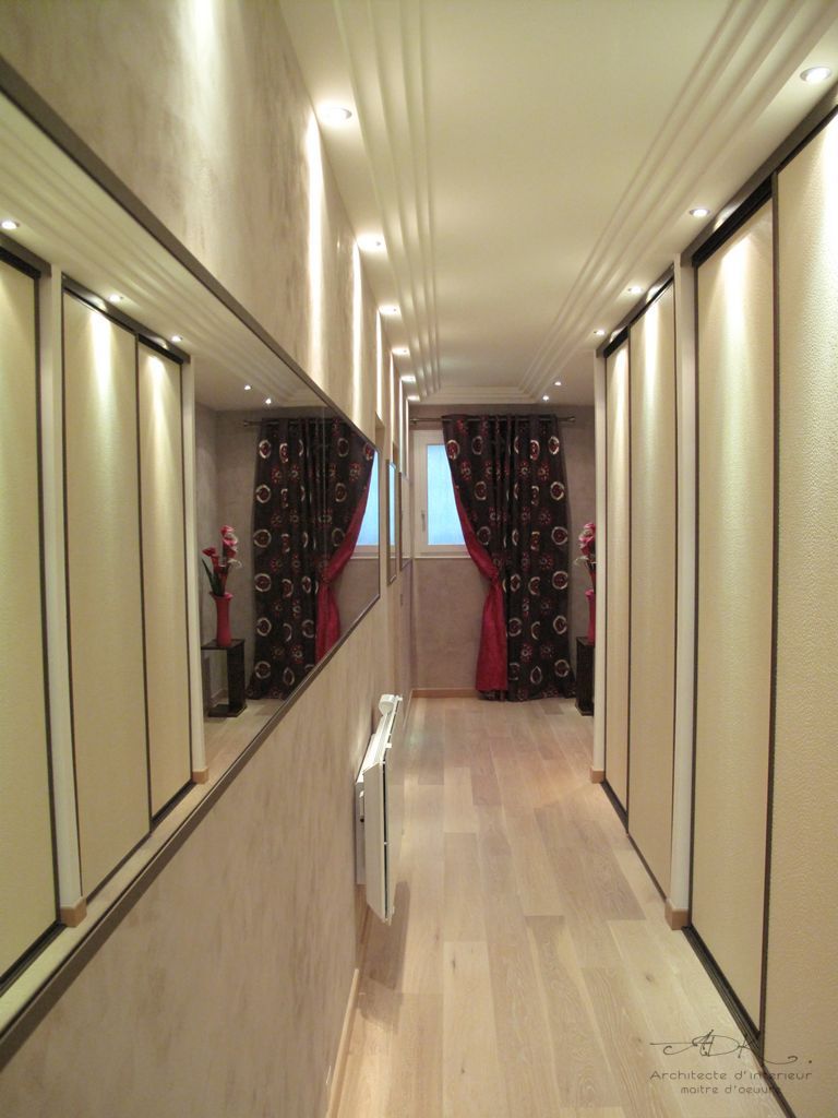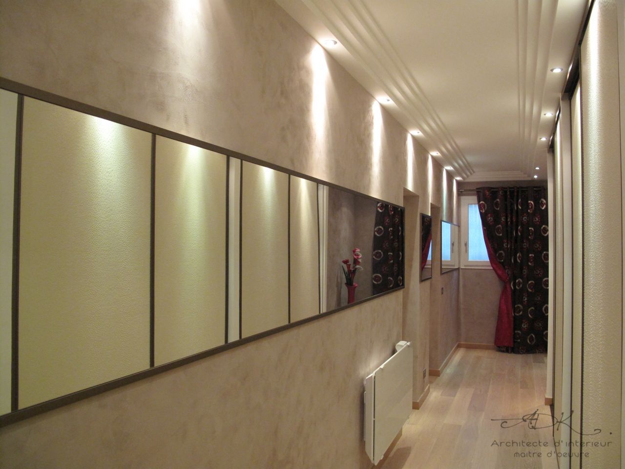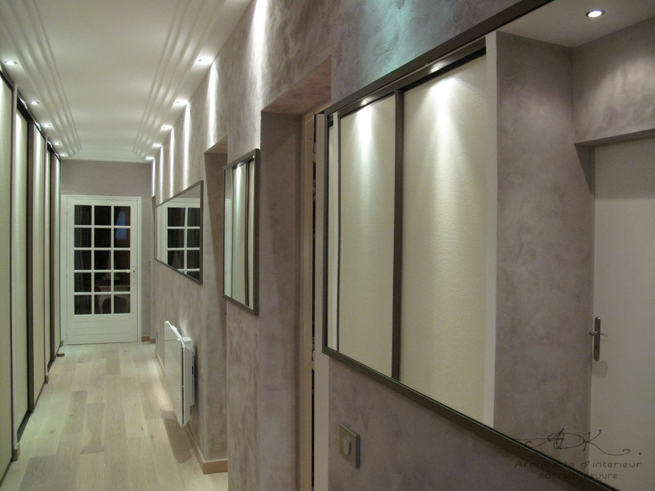 La réponse ADK : La maison disposait d’un trés long et large couloir, alors qu’il manquait un dressing dans la chambre parentale. ADK a joué sur la longueur en créant des corniches sous plafond pour y intégrer des spots et ajouter de longs miroirs pour accentuer le côté rectiligne.