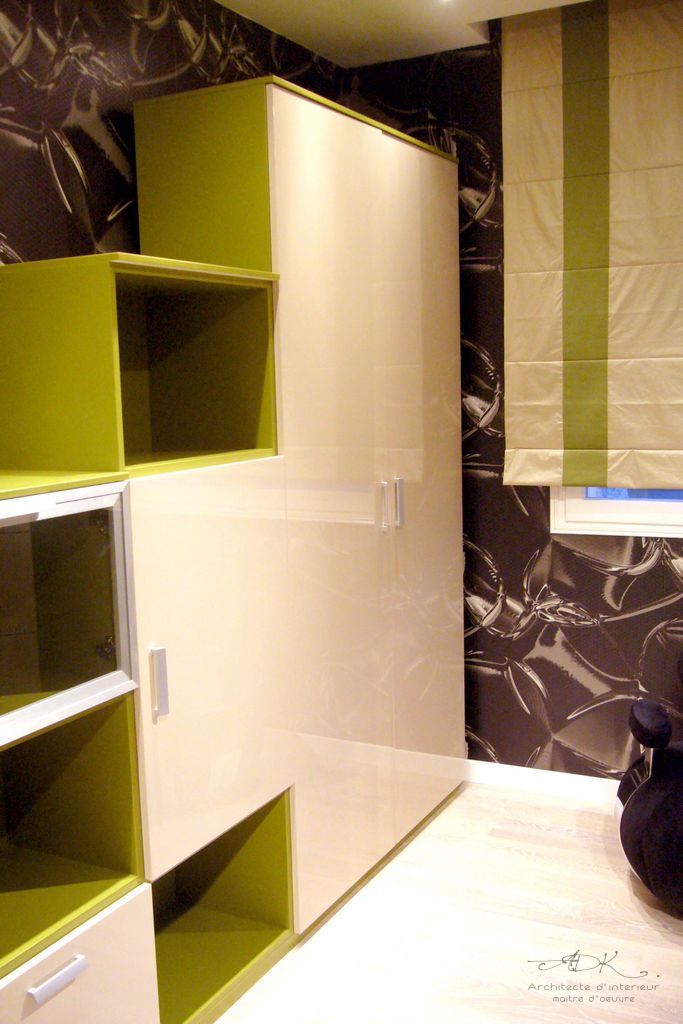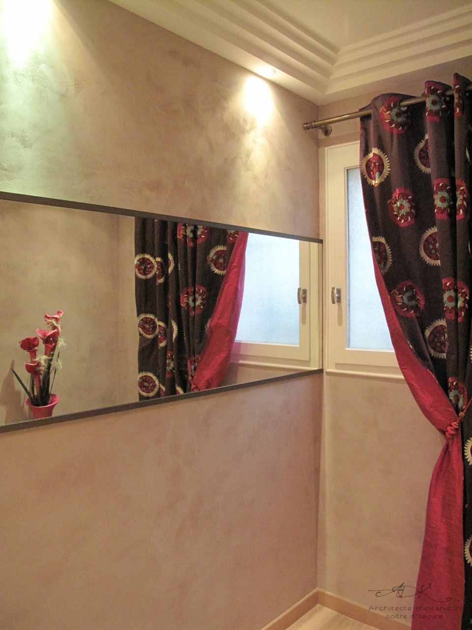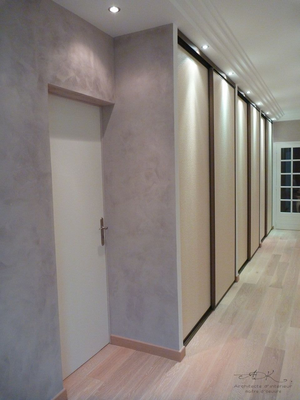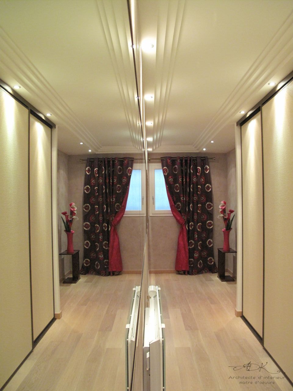 La réponse ADK : La maison disposait d’un trés long et large couloir, alors qu’il manquait un dressing dans la chambre parentale. ADK a joué sur la longueur en créant des corniches sous plafond pour y intégrer des spots et ajouter de longs miroirs pour accentuer le côté rectiligne.
