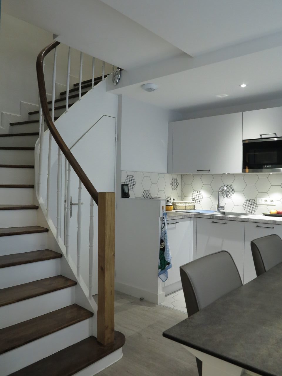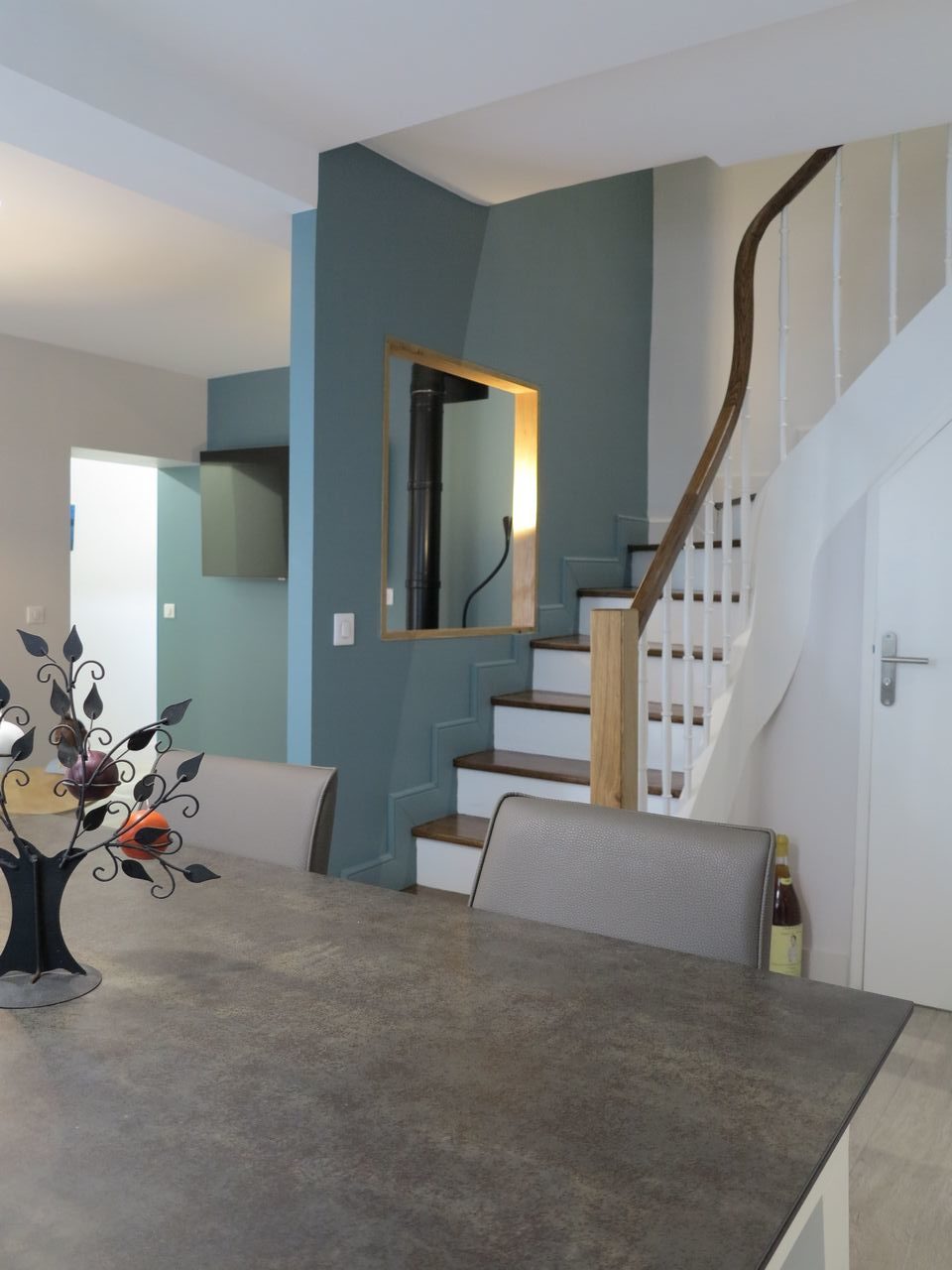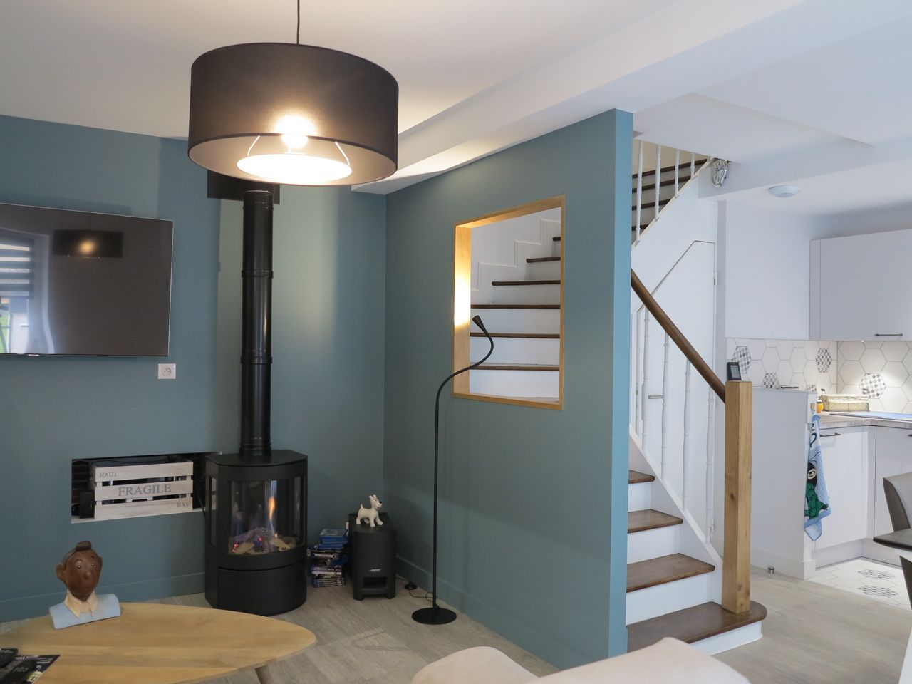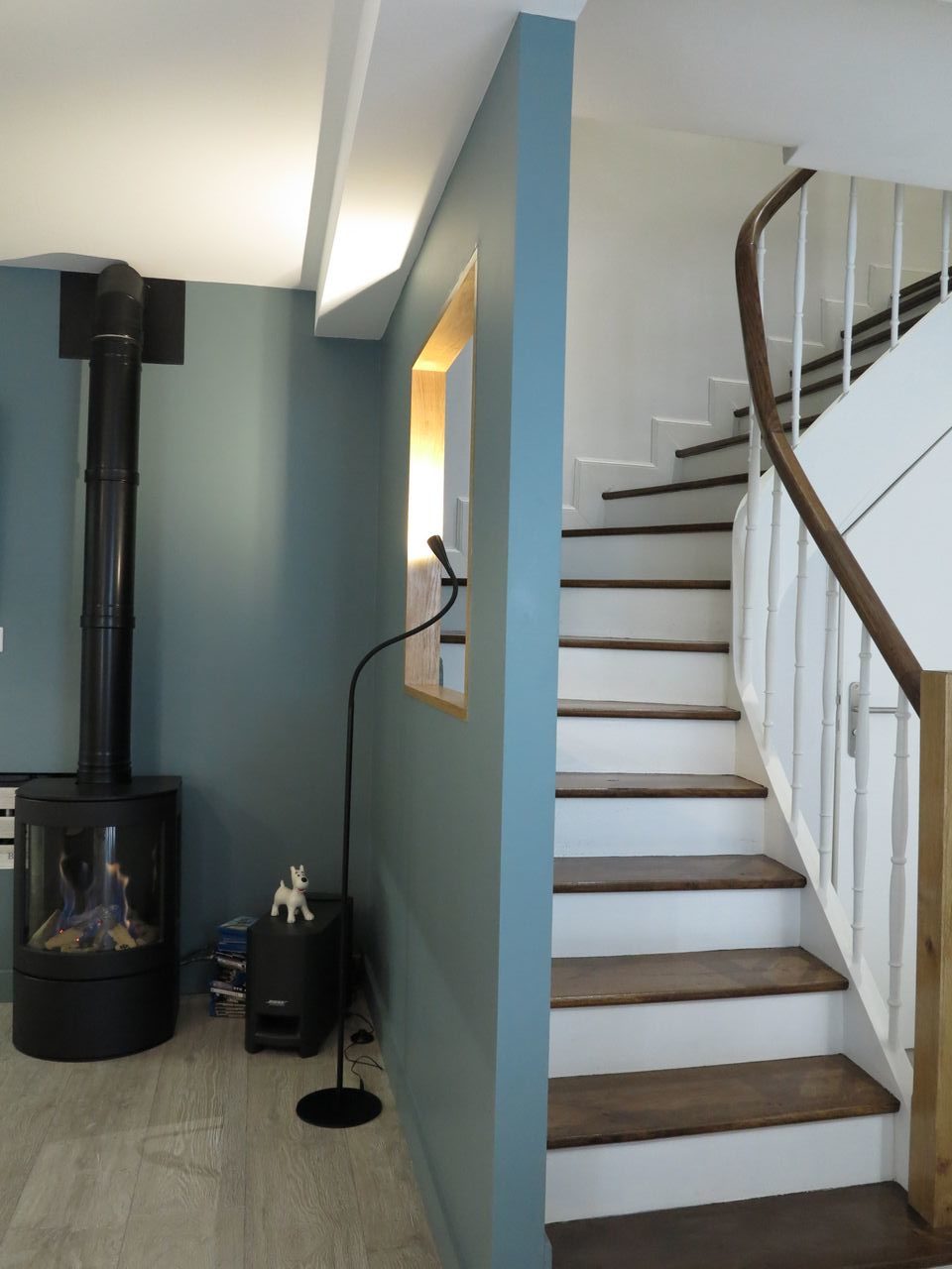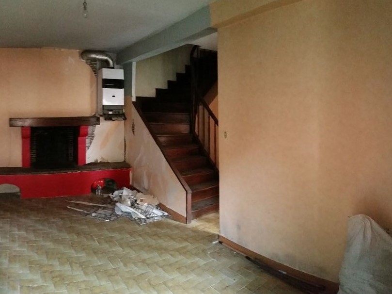 Au rez-de-chaussée, le WC a été déplacé sous l’escalier qui a été restauré et un poêle à gaz a été installé.