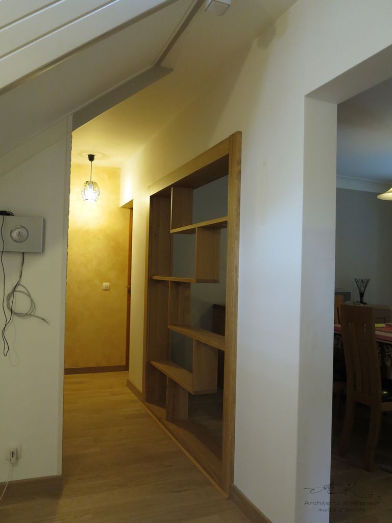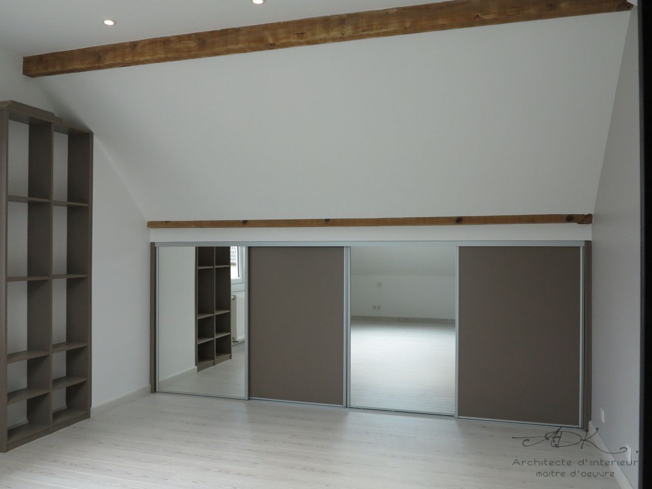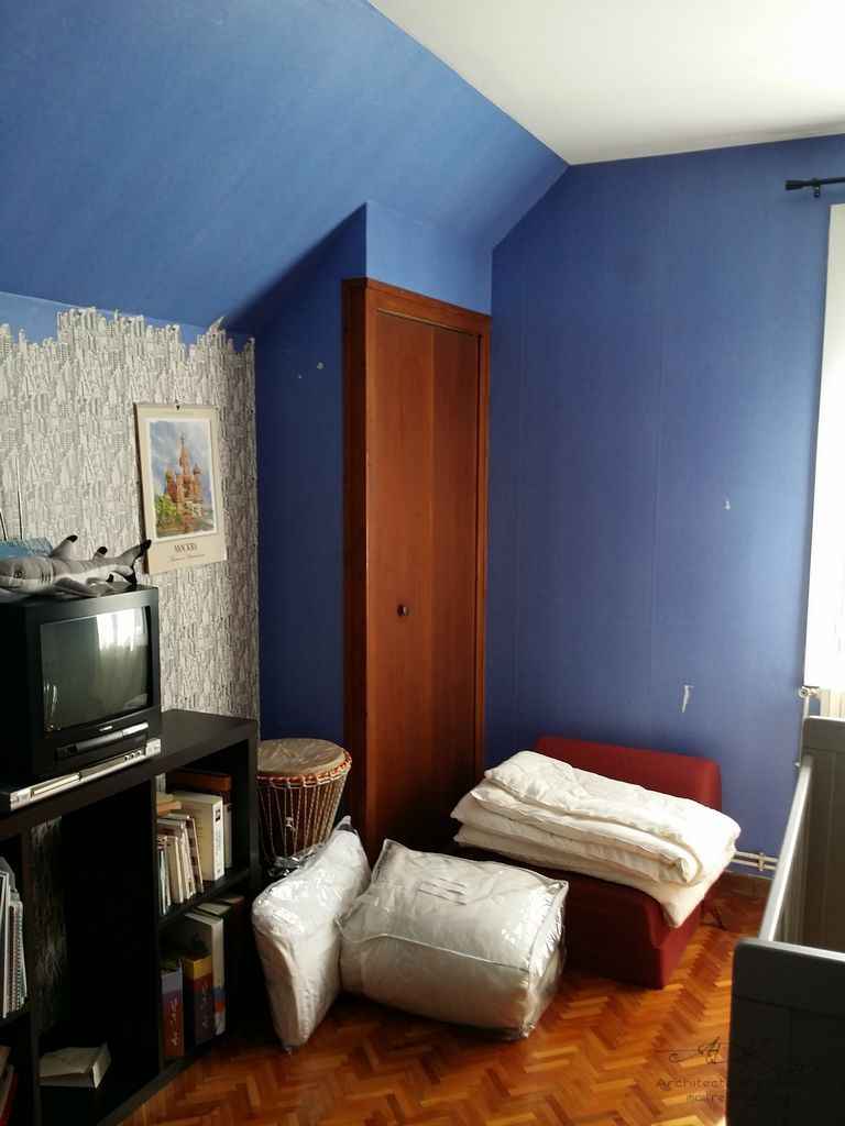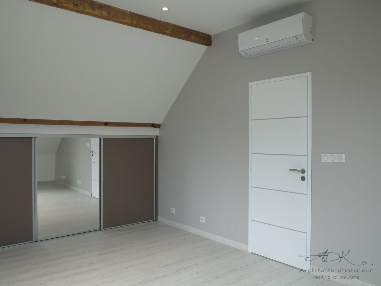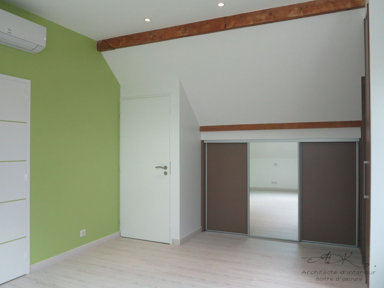 La réponse ADK : les combles étaient déjà composés d’une salle de bain et de deux chambres. ADK a revu l’agencement des chambres pour optimiser l’espace et gagner en mètres carré au sol. Beaucoup de placards et meubles sur-mesure ont été intégrés notamment dans la sous-pente.