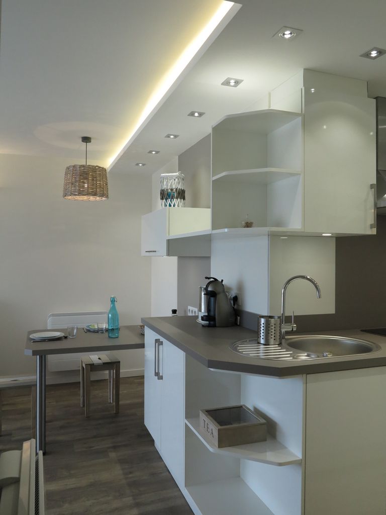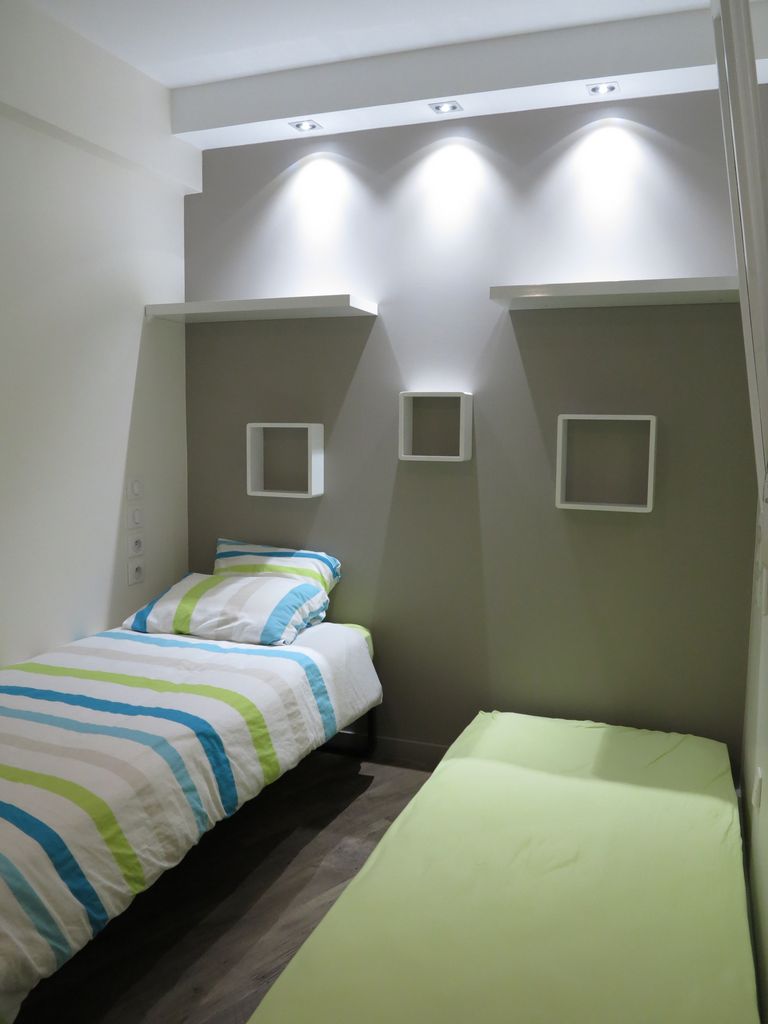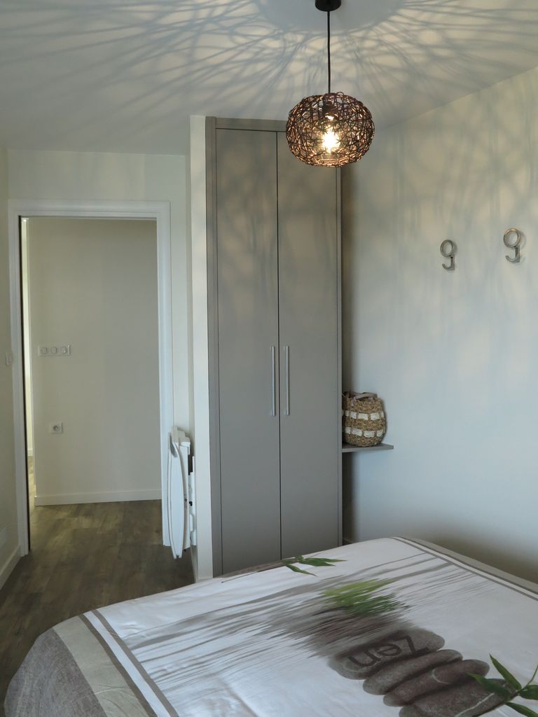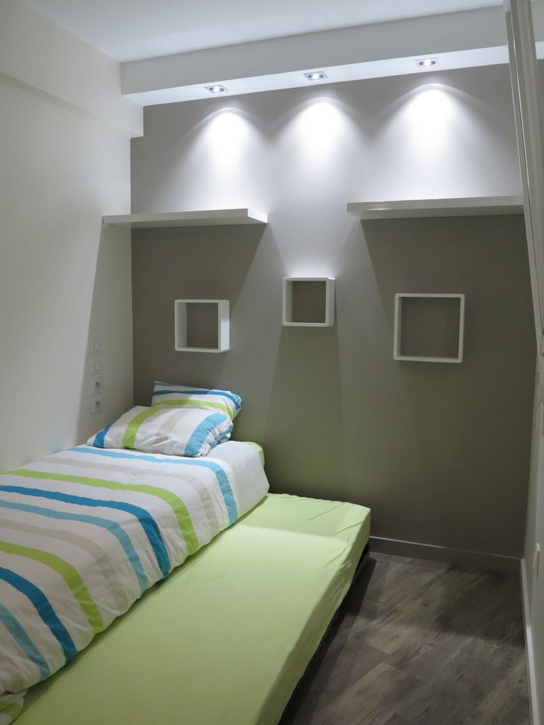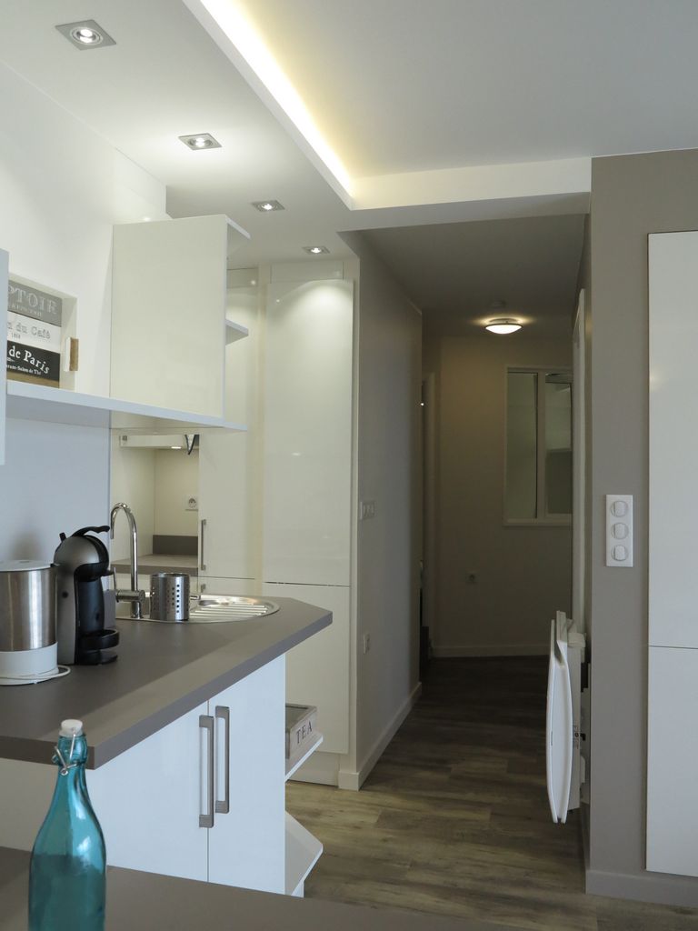 L’utilisation d’un sol PVC sur l’ensemble de l’appartement, la rénovation et l’intégration de placards dans la chambre principale, la création d’une petite chambre avec lits gigognes apportent fonctionnalité à cet appartement. L’ajout d’une verrière donnant sur le couloir permet la ventilation de la chambre aveugle. Pour donner plus de luminosité et de cachet à l’appartement, l’entreprise a intégré un faux-plafond et un jeu de lumières avec des bandeaux leds.