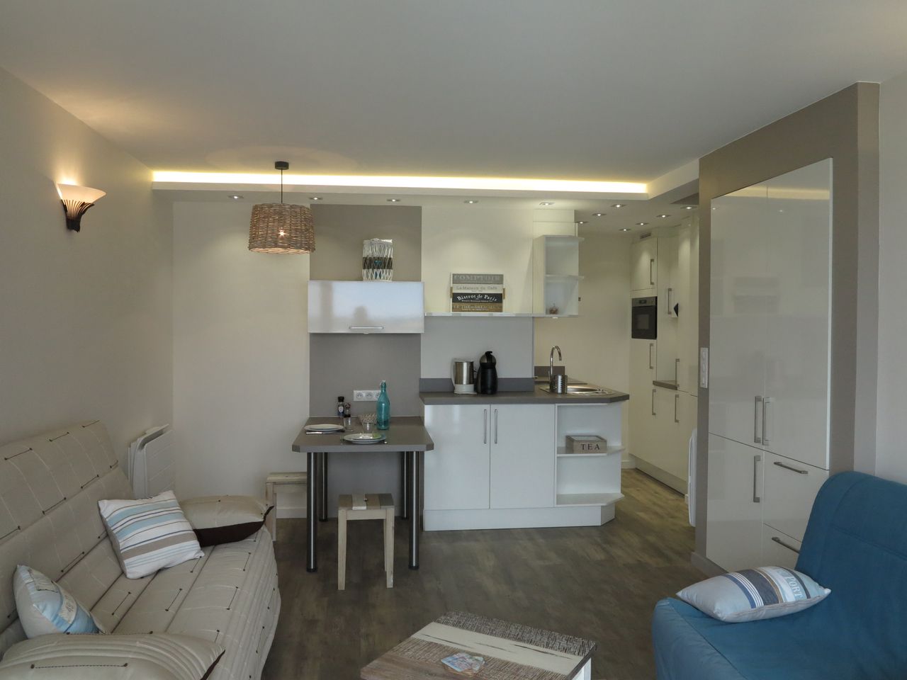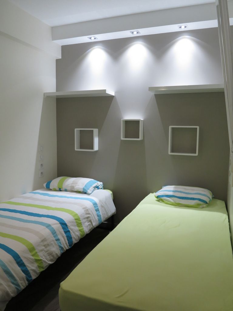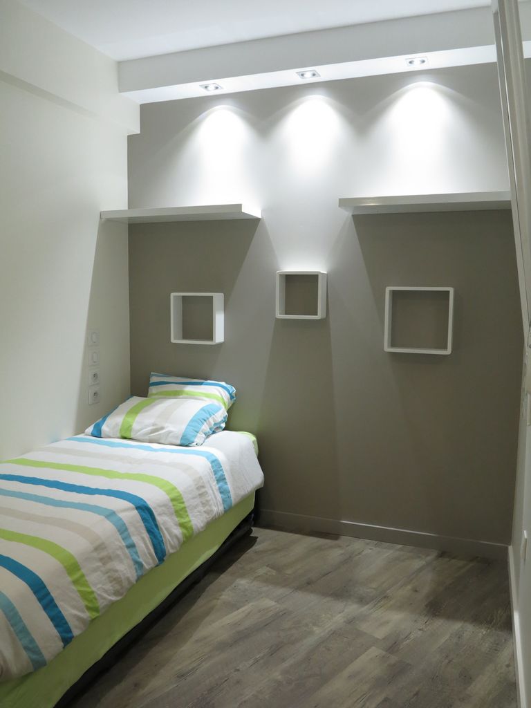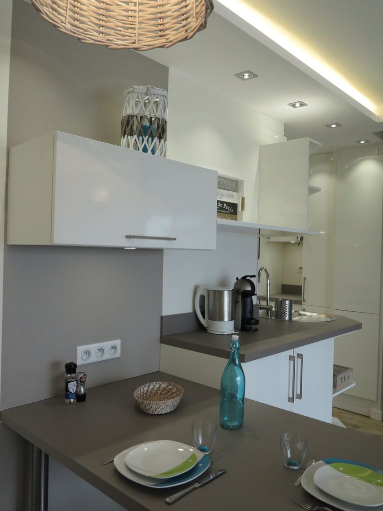 L’utilisation d’un sol PVC sur l’ensemble de l’appartement, la rénovation et l’intégration de placards dans la chambre principale, la création d’une petite chambre avec lits gigognes apportent fonctionnalité à cet appartement. L’ajout d’une verrière donnant sur le couloir permet la ventilation de la chambre aveugle. Pour donner plus de luminosité et de cachet à l’appartement, l’entreprise a intégré un faux-plafond et un jeu de lumières avec des bandeaux leds.
