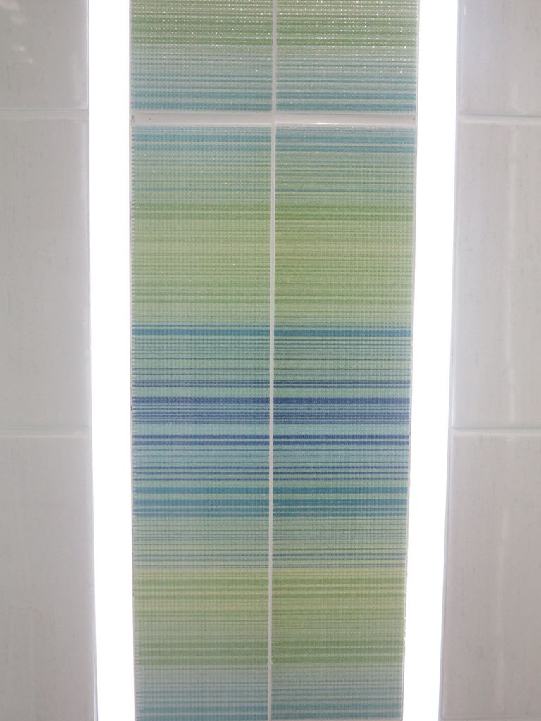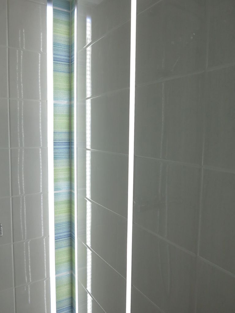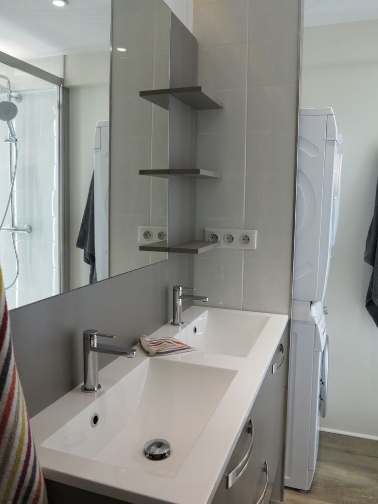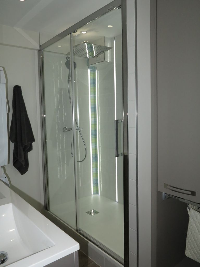 L’espace salle de bain a été refait, avec une très grande douche, un coin buanderie. Des leds ont aussi été ajoutés dans le carrelage pour apporter une lumière intéressante à cette salle de bain sans fenêtre.