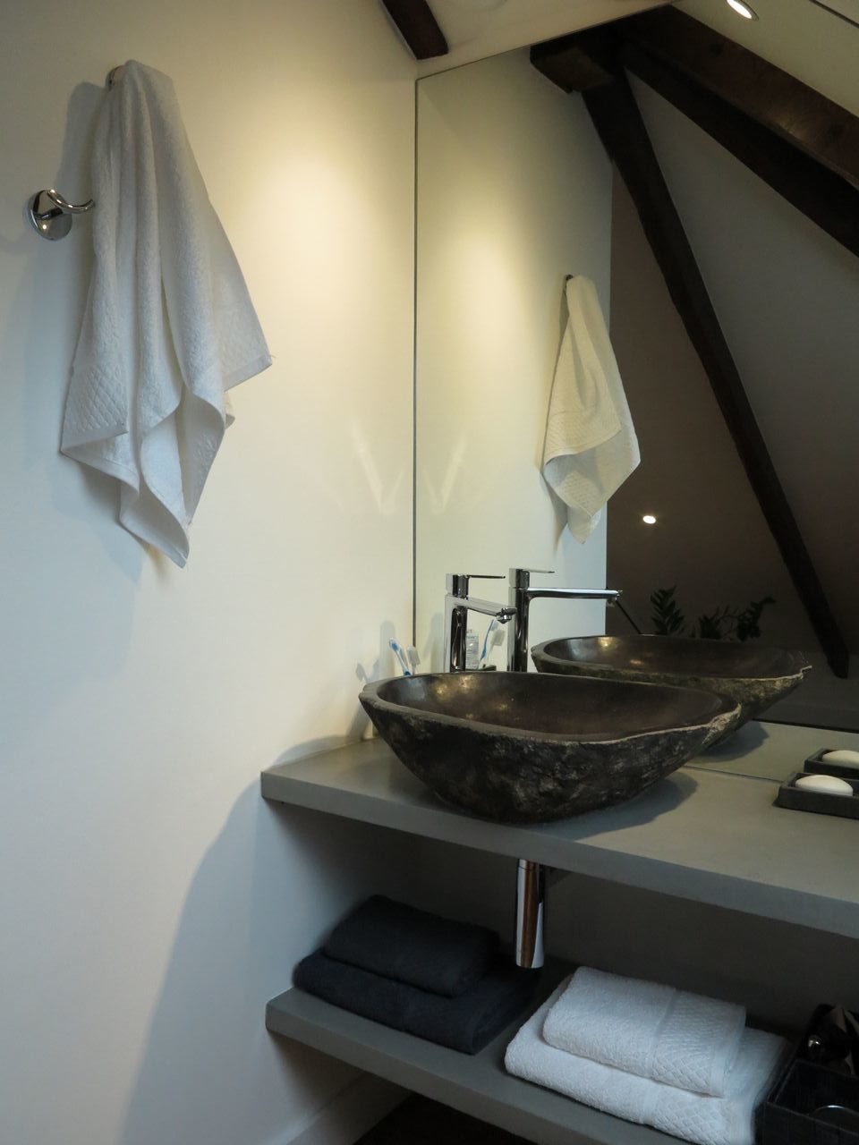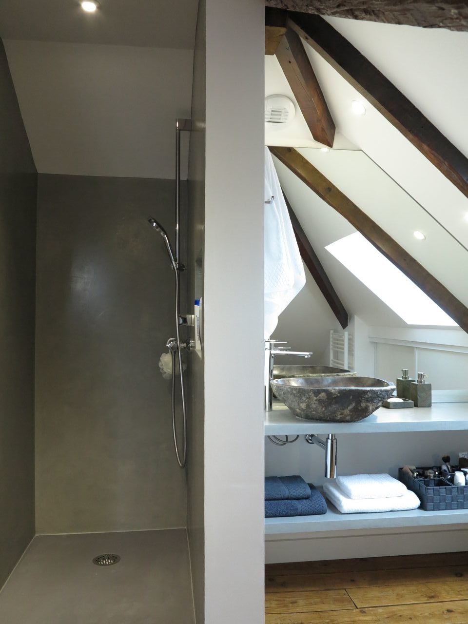 La réponse ADK : Après l’installation d’une grande vitre entre la salle de bain et la chambre, afin de garder le maximum de volume, ADK a créé une douche et un plan vasque en béton ciré. Le choix des vasques s’est porté sur une belle vasque en pierre pour conserver le côté minéral inspiré dans l’espace salle d’eau. Des WC ont été installés sur un palier intermédiaire, et l’isolation a été complètement refaite.